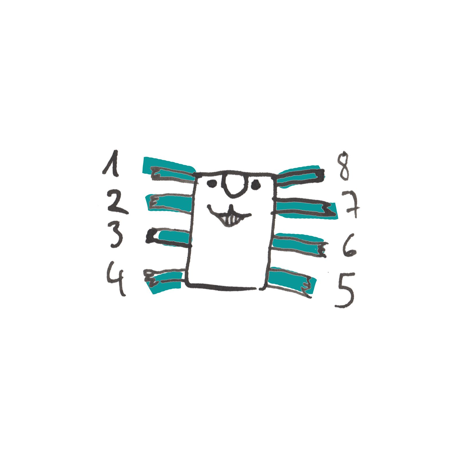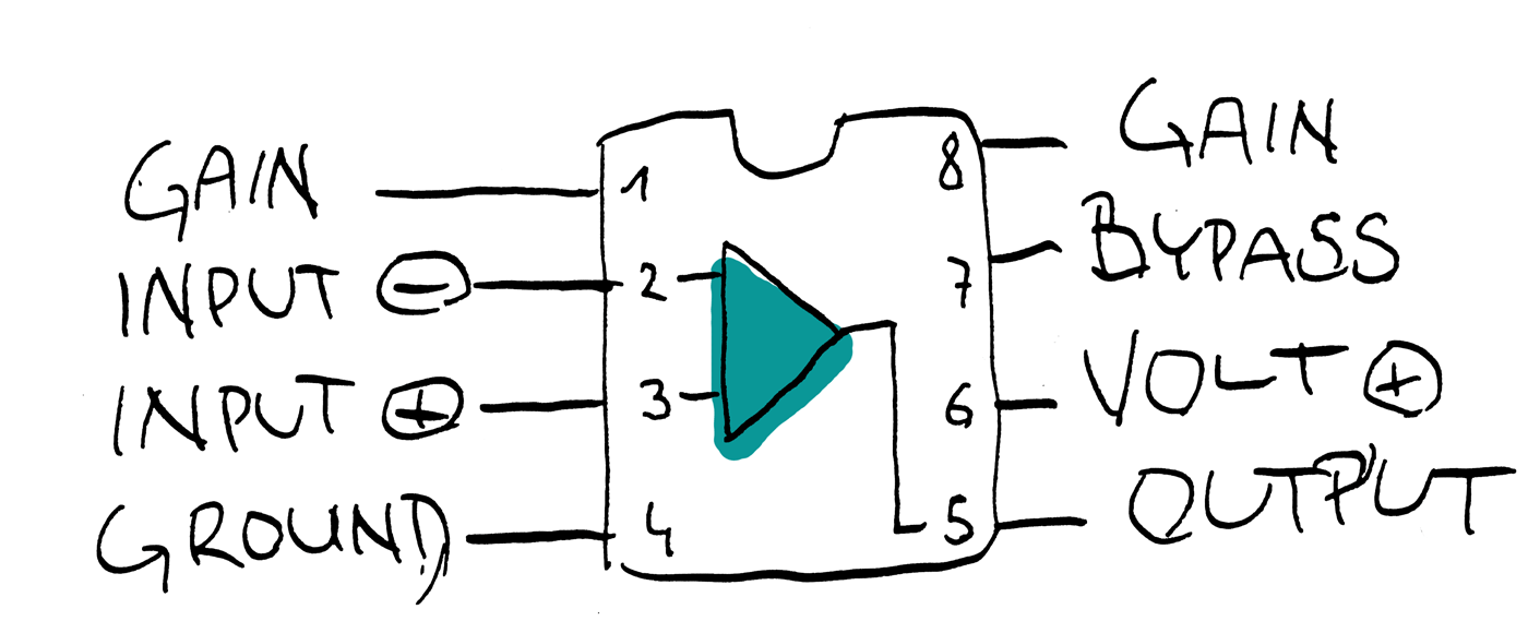 This is named LM386, and looks like an insect with a little notch on its head. The leg at the left side of the notch-head is leg number one. Count counter clock wise from leg number one and give each leg a different number.