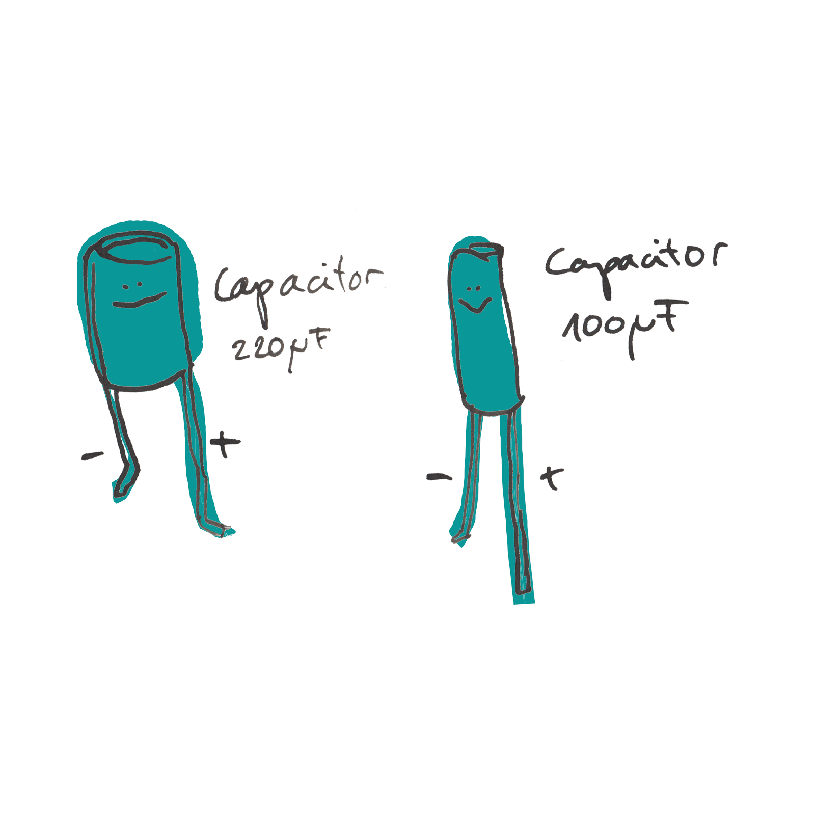 The capacitor has a long leg and a short leg, like the LED. The short leg is for minus (ground) and the long leg is plus (power). Connect the 100 uF capacitor with the short leg to the chip’s leg number 1