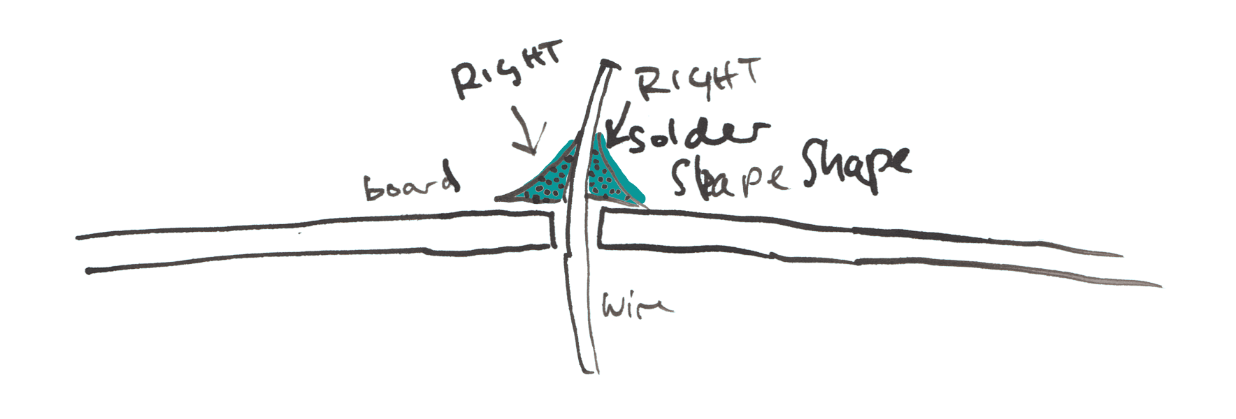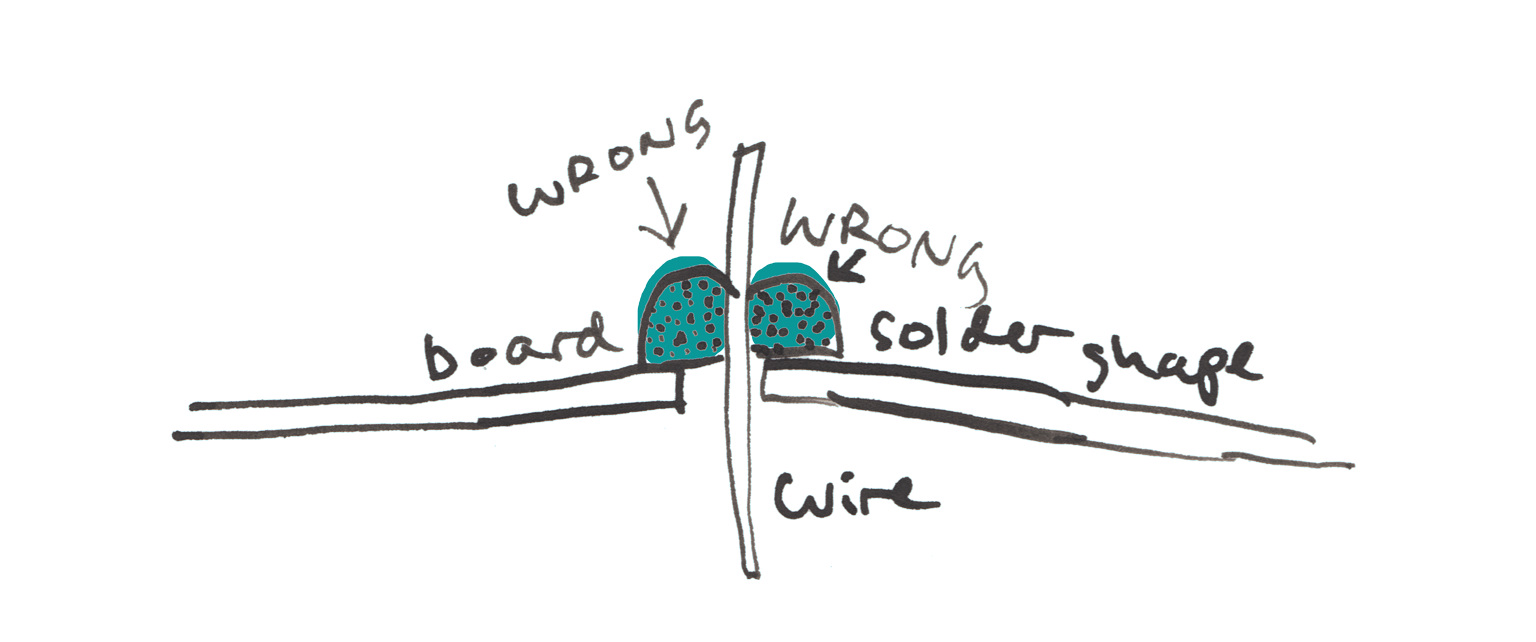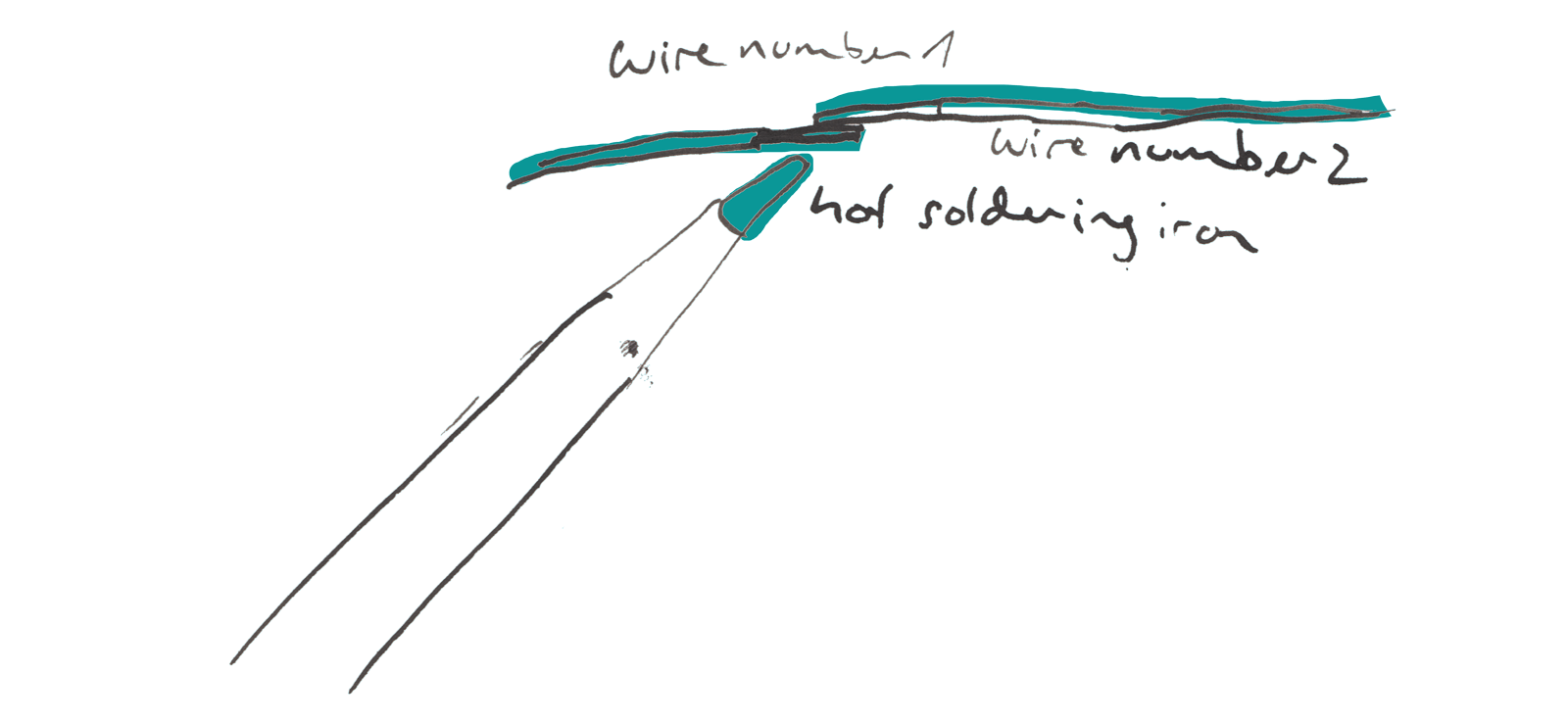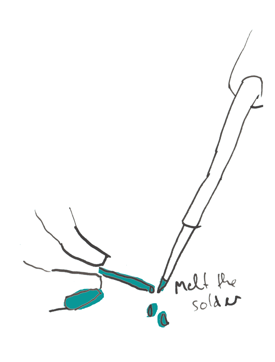 Soldering is not a mechanical process like glueing, it is a chemical process. The two metals or wires you’d like to fuse together will need to touch and get really hot at the same time, and the ‘glue’ - the solder - must melt between them. Once the melted solder gets cold again it turns hard. The two metal pieces are then stuck together and can conduct electricity.