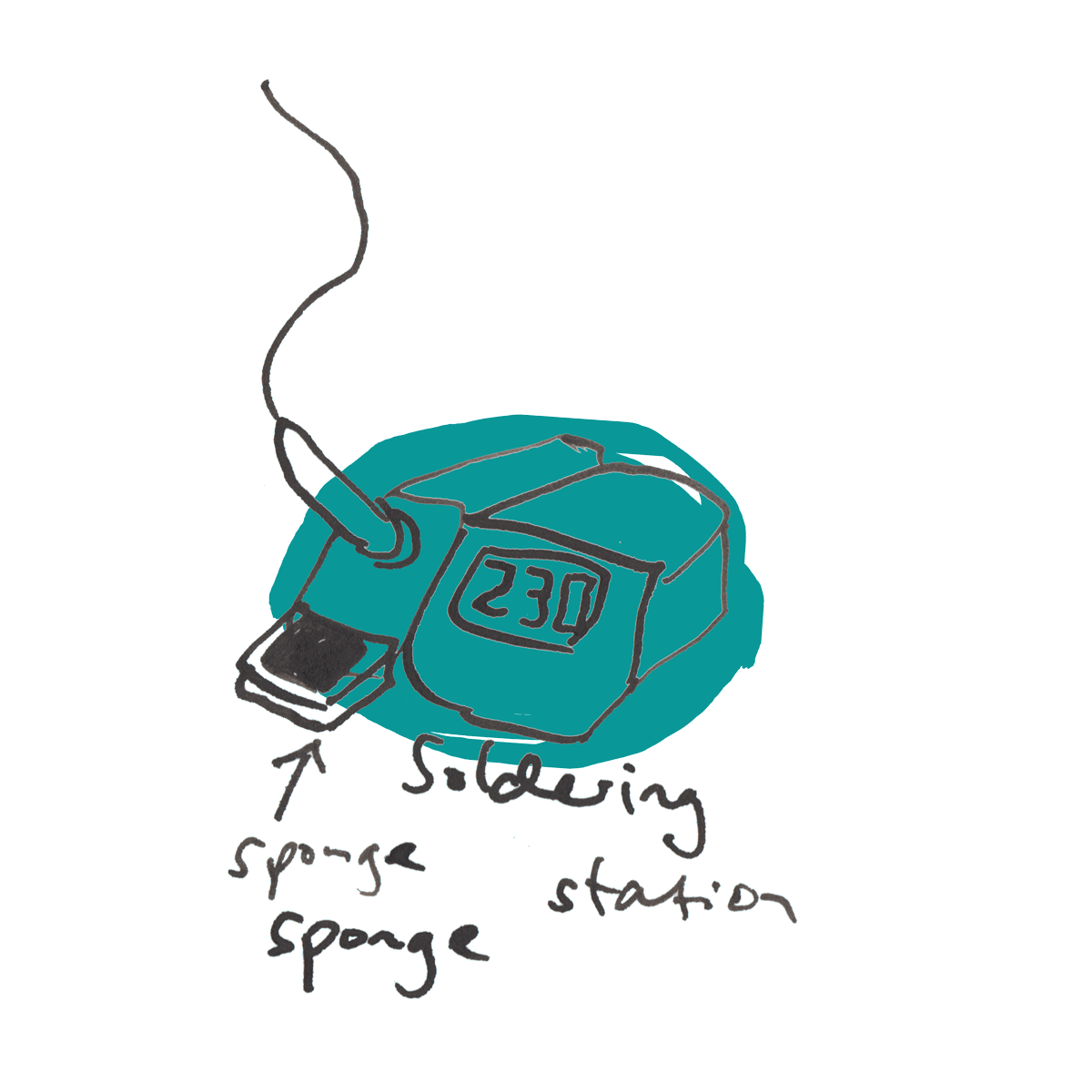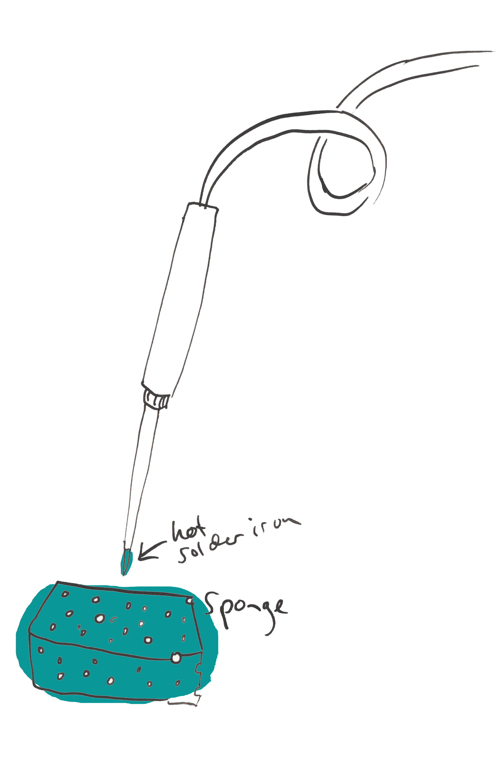 Take a soldering iron and melt some solder on it. The melting point is around 230ºC (or 460ºF). Take the melted drop of solder off the tip of your soldering iron by rubbing it against a moist sponge. The drops of solder on the sponge will turn into beautiful tiny round pearls. The peak of the soldering iron should now have a silvery surface from the solder.